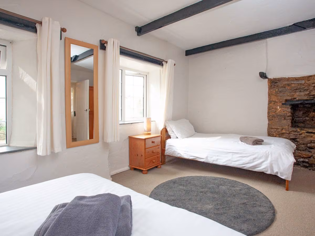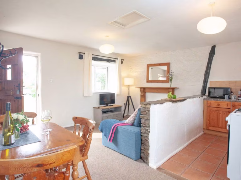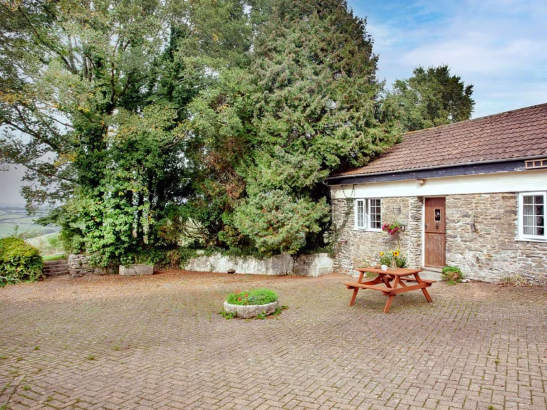 The Linhay sleeps 3 (+cot) in one large bedroom with a double and a single bed. It also has an open plan living area and kitchen, as well as a bathroom with a shower and bath. The back of the cottage faces out onto the fields and valley and to the front there is a spacious courtyard area with seating for alfresco dining and lounging in the sun.